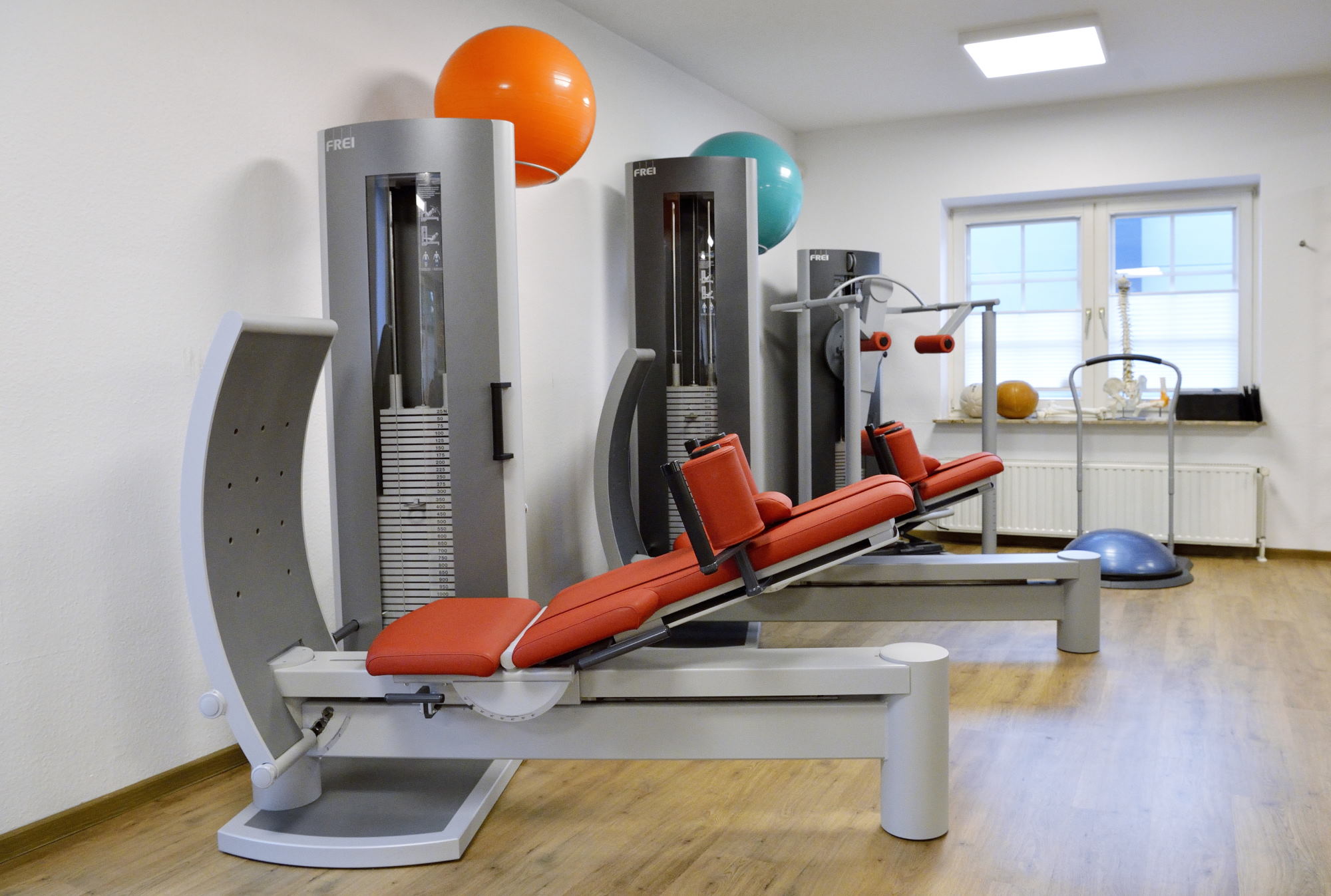 In unserem großen Übungsraum trainieren Sie an modernen Krafttrainingsgeräten. Unsere Therapeuten weisen Sie in die Trainingsgeräte ein und begleiten fortlaufend Ihre weiteren Trainingseinheiten. Für das Ausdauertraining stehen Laufbänder, Fahrrad- und Handergometer oder ein Crosstrainer zur Verfügung. Das sogenannte sensomotorische Funktionstraining, dass u.a. zum Aufbau der wichtigen Tiefenmuskulatur dient, findet auf zahlreichen instabilen Unterlagen, Balanceboards oder mit anderen vielfältigen Hilfsmitteln statt, um gestörte Funktionen wieder anzubahnen.