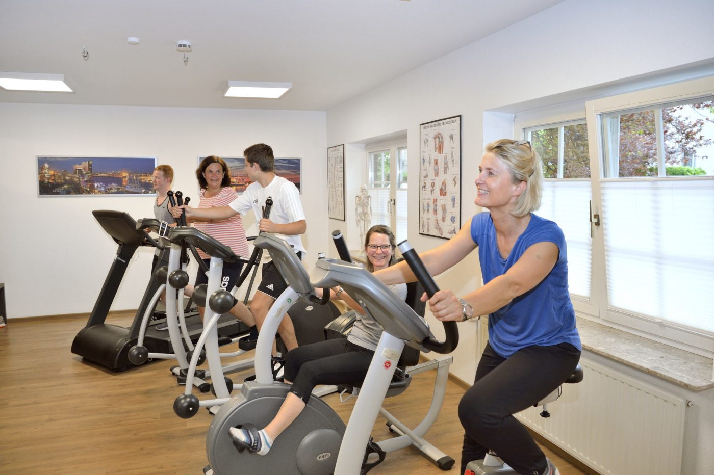 In unserem großen Übungsraum trainieren Sie an modernen Krafttrainingsgeräten. Unsere Therapeuten weisen Sie in die Trainingsgeräte ein und begleiten fortlaufend Ihre weiteren Trainingseinheiten. Für das Ausdauertraining stehen Laufbänder, Fahrrad- und Handergometer oder ein Crosstrainer zur Verfügung. Das sogenannte sensomotorische Funktionstraining, dass u.a. zum Aufbau der wichtigen Tiefenmuskulatur dient, findet auf zahlreichen instabilen Unterlagen, Balanceboards oder mit anderen vielfältigen Hilfsmitteln statt, um gestörte Funktionen wieder anzubahnen.